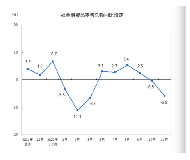 國(guó)家統(tǒng)計(jì)局今日最新發(fā)布的月度數(shù)據(jù)顯示,受疫情短期沖擊加大影響,11月份工業(yè)、投資、消費(fèi)等數(shù)據(jù)有所回落。11月份社會(huì)消費(fèi)品零售總額同比下降5.9%,此前市場(chǎng)預(yù)期11月的消費(fèi)增長(zhǎng)是-3.7%,但中西藥品類(lèi)商品零售額同比增長(zhǎng)8.3%。