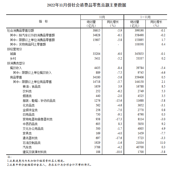 按消費(fèi)類(lèi)型分,11月份,商品零售34180億元,同比下降5.6%;餐飲收入4435億元,下降8.4%。1—11月份,商品零售359406億元,同比增長(zhǎng)0.5%;餐飲收入39784億元,下降5.4%。