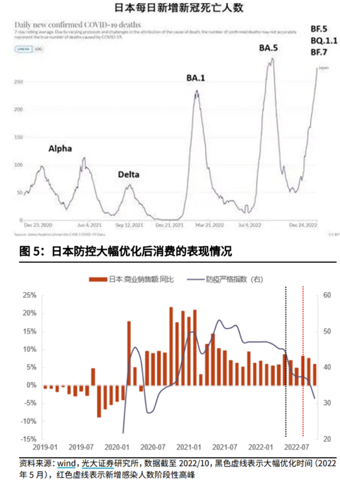 拿日本的數(shù)據(jù)來(lái)說(shuō),日本在放開(kāi)后如今已經(jīng)在面臨第8次波峰了,但是消費(fèi)數(shù)據(jù)并沒(méi)有伴隨疫情波峰出現(xiàn)明顯震蕩。反而可以看到疫情波峰的到來(lái),背后原因恰恰是人們出門(mén)更多導(dǎo)致的,因此消費(fèi)的波峰反而與疫情波峰同步。