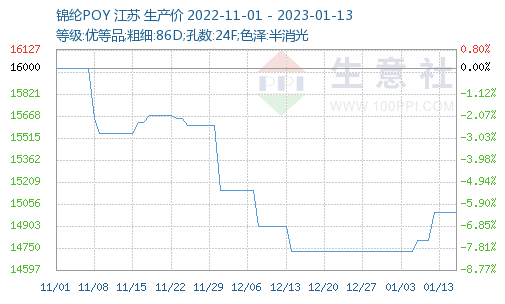 據(jù)生意社價格監(jiān)測顯示,上周(2023年1月9—13日),錦綸長絲價格平穩(wěn),截止2023年1月13日,江蘇地區(qū)錦綸長絲DTY(優(yōu)等品;70D/24F)報價17220元/噸;錦綸POY(優(yōu)等品;86D/24F)報價15000元/噸;錦綸FDY(優(yōu)等品:40D/12F)價格報18025元/噸。