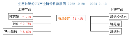 上周(2023年1月9—13日)上游端成本支撐,原料己內(nèi)酰胺現(xiàn)貨市場價格上漲,成本端支撐稍好,據(jù)生意社大宗榜數(shù)據(jù)顯示,1月8日國內(nèi)液體己內(nèi)酰胺市場均價為11233元/噸,1月13日國內(nèi)液體己內(nèi)酰胺市場均價為11766元/噸,較上周價格上漲533元/噸,周漲幅 4.74%。
