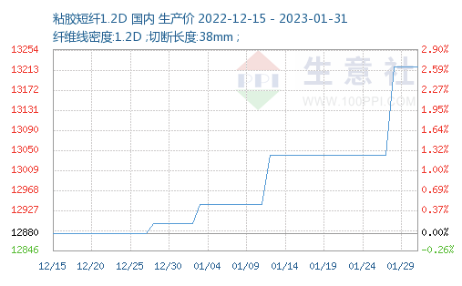 根據(jù)生意社價格監(jiān)測,2023年1月,粘膠短纖價格小幅走高,截止至2023年1月31日,1.2D*38mm粘膠短纖國內(nèi)地區(qū)出廠報價為13220元/噸;較上月價格上漲320元/噸,月漲幅2.48%。 人棉紗價格跟隨微微上調(diào),截止至2023年1月31日(30S,環(huán)錠紡,一等品)出廠均價為17633元/噸,較上月價格上漲167元/噸,月漲幅0.95%。