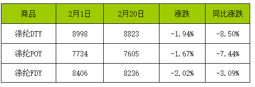 2月滌綸長絲市場均價(jià)漲跌情況單位:元/噸