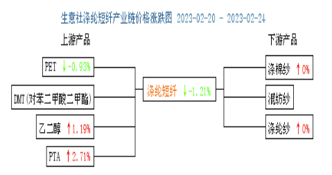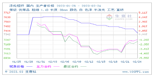 期貨市場:上周(2.20-2.24)短纖期貨主力窄幅震蕩收漲。周五短纖PF期貨主力合約收于7278,較上周收盤價上漲2.97%。結算價為7258元。上周國內(nèi)短纖上游原料PTA期貨主力上漲3.68%收于5638,乙二醇期貨主力上漲3.77%收于4354。