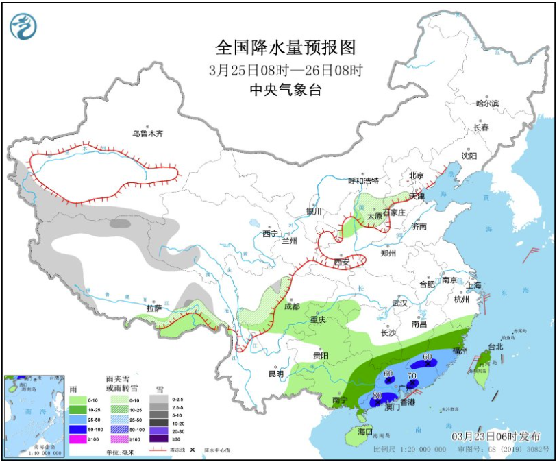 3月25日08時至26日08時,新疆南疆高海拔山區(qū)、西藏北部和南部、青海西南部、山西中部、川西高原等地部分地區(qū)有小到中雪或雨夾雪。湖南南部、江西南部、福建大部、廣西東部、廣東大部等地部分地區(qū)有中到大雨,其中,江西南部、廣東中部和南部等地部分地區(qū)有暴雨(50~80毫米)(見圖6)。