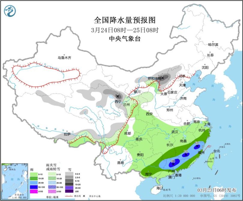 3月24日08時至25日08時,青海北部、甘肅河西和南部、寧夏南部、陜西北部、內蒙古河套地區(qū)、山西北部、川西高原等地部分地區(qū)有小到中雪或雨夾雪,局地有大雪。湖南南部、江西中南部、浙江東南部、福建、廣西中部和東部、廣東中東部等地部分地區(qū)有中到大雨,其中,江西南部、福建北部、廣東北部等地部分地區(qū)有暴雨(50~90毫米)(見圖5)。黃海中部和南部海域將有7~8級、陣風9級的偏北到東北風。
