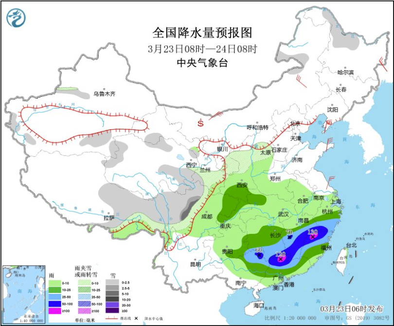 3月23日08時至24日08時,內蒙古東部、黑龍江西北部、西藏東部、青海東部、甘肅南部、川西高原、陜西北部、山西中部等地的部分地區(qū)有小到中雪或雨夾雪,局地有大雪。貴州東南部、湖南南部、江西中南部、浙江南部、福建西部和北部、廣西東北部、廣東北部等地的部分地區(qū)有大到暴雨,其中,廣東西北部、福建西北部等地局地有大暴雨(100~130毫米)。內蒙古大部、遼東半島、山東半島等地的部分地區(qū)有4~6級風(見圖4)。黃海大部海域將有7~8級、陣風9級的偏北到東北風。