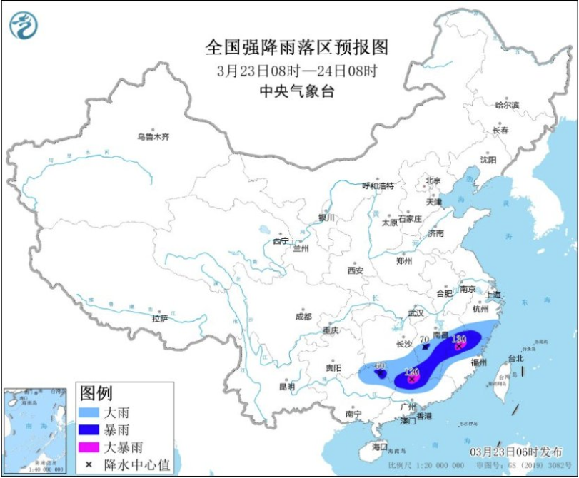 預計,3月23日08時至24日08時,貴州東南部、湖南南部、江西中南部、浙江南部、福建西部和北部、廣西東北部、廣東北部等地的部分地區(qū)有大到暴雨,其中,福建西北部、廣東西北部等地局地有大暴雨(100~130毫米)。上述部分地區(qū)伴有短時強降水(最大小時降雨量20~50毫米,局地可超過60毫米),局地有雷暴大風或冰雹等強對流天氣。中央氣象臺3月23日06時發(fā)布暴雨藍色預警和繼續(xù)發(fā)布強對流天氣藍色預警。