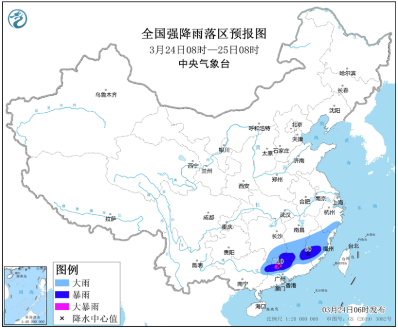 3月24日08時(shí)至25日08時(shí),西藏南部、川西高原、青海東部、甘肅河西和東部、內(nèi)蒙古中部、山西北部、河北西北部等地的部分地區(qū)有小到中雪或雨夾雪,其中,青海東北部、內(nèi)蒙古中部、河北西北部等地局地有大雪。湖南東南部、江西中南部、浙江南部、福建大部、廣西東北部、廣東西部和北部等地的部分地區(qū)有大到暴雨,其中,廣東西北部等地局地有大暴雨(100~110毫米)。內(nèi)蒙古東部、遼東半島、浙江東部沿海等地的部分地區(qū)有4~6級(jí)風(fēng)。黃海大部海域、東海西北部海域?qū)⒂?~8級(jí)風(fēng),陣風(fēng)可達(dá)9級(jí)。