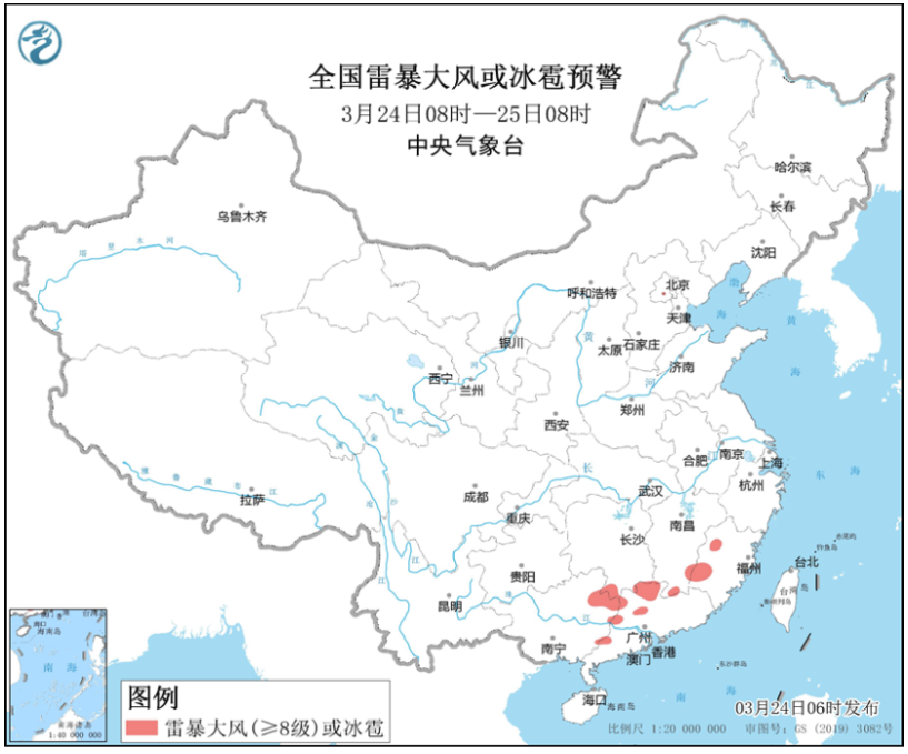 預(yù)計(jì),3月24日08時(shí)至25日08時(shí),湖南東南部、江西中南部、浙江南部、福建大部、廣西東北部、廣東西部和北部等地的部分地區(qū)有大到暴雨,其中,廣東西北部等地局地有大暴雨(100~110毫米)。上述部分地區(qū)伴有短時(shí)強(qiáng)降水(最大小時(shí)降雨量20~50毫米,局地可超過60毫米)。湖南南部、江西南部、福建西部、廣西東北部、廣東北部和西部等地的部分地區(qū)將有8-10級(jí)雷暴大風(fēng)或冰雹天氣(見圖1、圖2)。中央氣象臺(tái)3月24日06時(shí)繼續(xù)發(fā)布暴雨藍(lán)色預(yù)警和強(qiáng)對(duì)流天氣藍(lán)色預(yù)警。