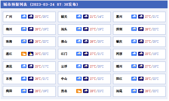 城市中,廣州今天白天陰天,雷陣雨轉大到暴雨,夜間陰天,有中到大雨,局部暴雨;氣溫介于22℃~26℃之間,相對濕度介于80%~98%之間,吹和緩的東南風。