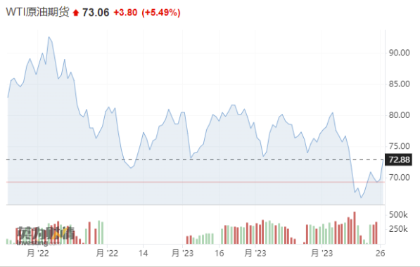 具體行情顯示,紐約商品交易所5月交貨的輕質(zhì)原油期貨價格周一收漲超5%,報每桶72.81美元,為近兩周以來的最高水平;截至發(fā)稿,5月交貨的倫敦布倫特原油期貨價格漲4%,報每桶78.03美元。