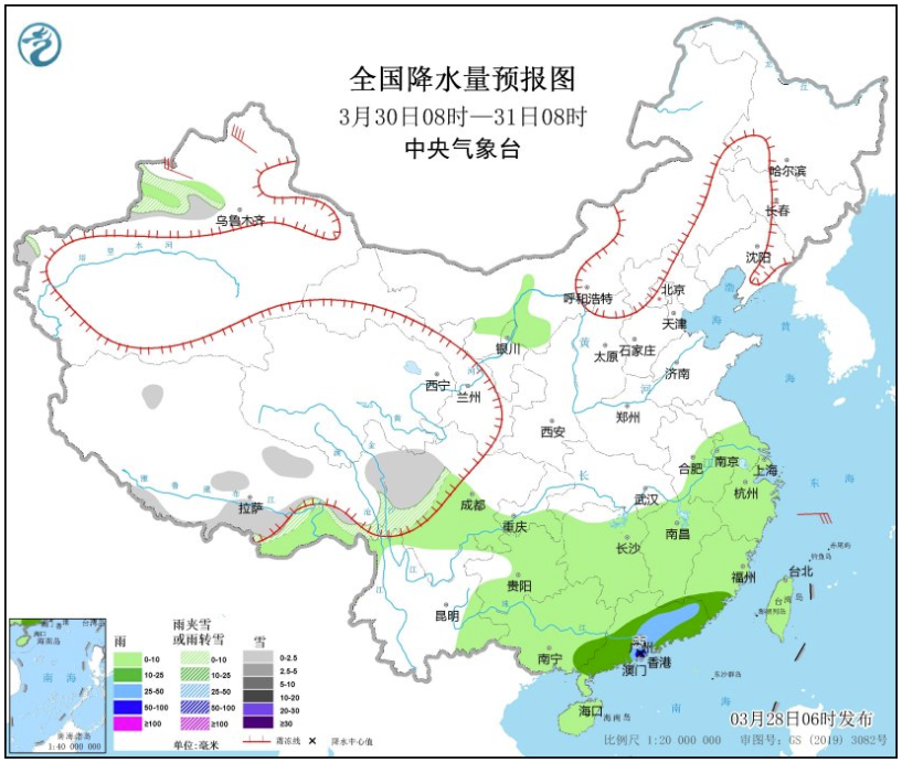 3月30日08時至31日08時,新疆沿天山地區(qū)和伊犁河谷、西藏東部和南部、川西高原北部等地部分地區(qū)有小雪或雨夾雪。廣西東南部、廣東中南部、福建南部等地的部分地區(qū)有中到大雨,局地有暴雨(50~55毫米)。新疆北疆北部等地部分地區(qū)有5~7級風(fēng)(見圖3)。