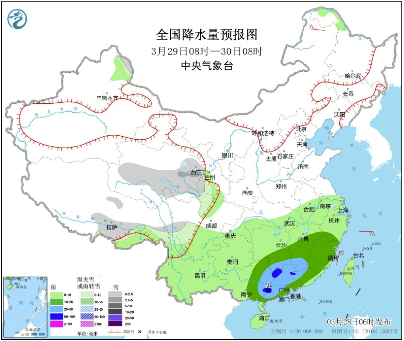 3月29日08時至30日08時,西藏南部、青海南部和東部、甘肅西南部、川西高原等地部分地區(qū)有小雪或雨夾雪,其中,青海東部局部有中雪。江南中南部、華南大部等地部分地區(qū)有中到大雨,其中,廣西東部、廣東西部等地部分地區(qū)有暴雨(50~75毫米)。內(nèi)蒙古東部、黑龍江西部等地部分地區(qū)有4~6級風(fēng)(見圖2)。臺灣海峽將有5~7級、陣風(fēng)8級的東北風(fēng)轉(zhuǎn)偏北風(fēng)。
