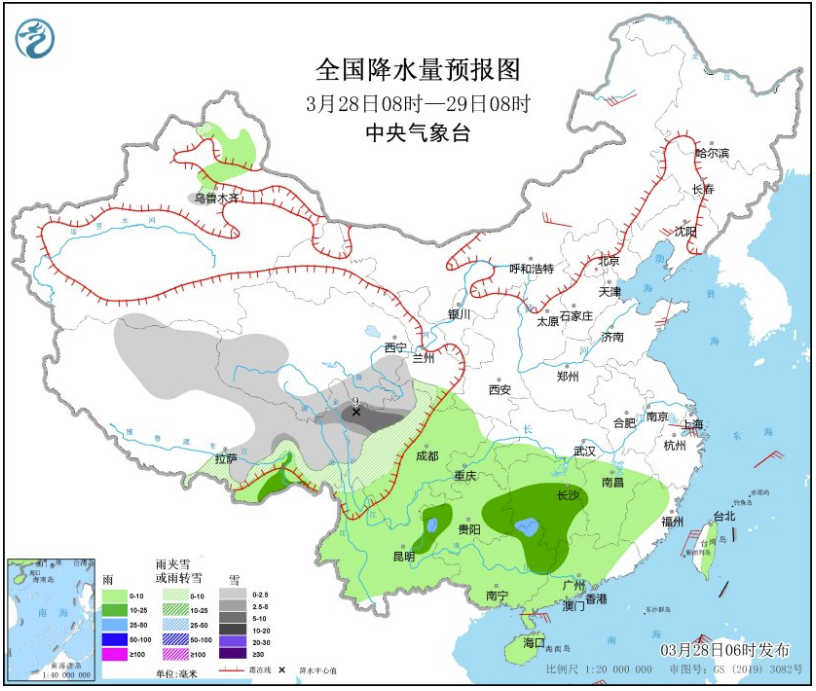 圖1 全國降水量預(yù)報圖(3月28日08時-29日08時)