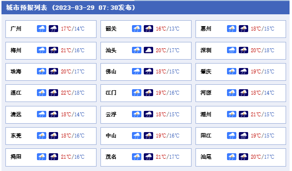 城市中,廣州今天多云到陰天,有雷陣雨局部大雨;夜間陰天,有大雨局部暴雨;氣溫15℃~17℃,相對(duì)濕度80%~95%,吹和緩的東北風(fēng)。