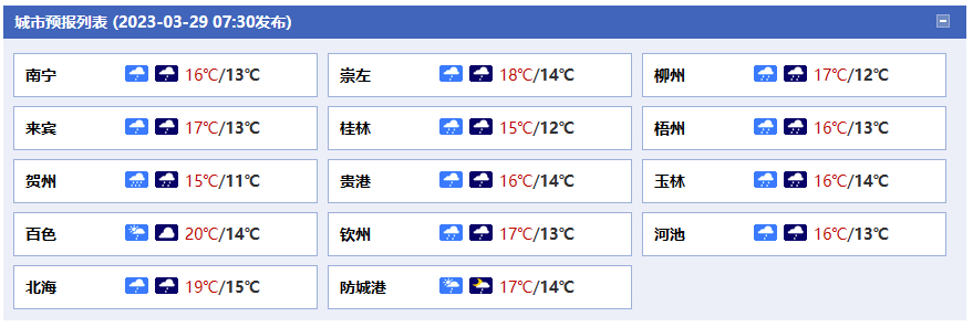 南寧市:今天白天到晚上,陰天有小雨,東北風1~2級,最低溫度13℃,最高溫度16℃。