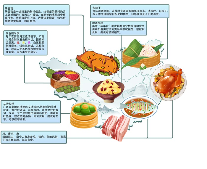 清明來臨之際,除了祭祖、掃墓和踏青,品嘗獨特的清明美食也是必不可少的。在廣西,清明特色美食品種繁多,有清香爽口的五色糯米飯,有金黃脆口的巴馬小香豬,有南寧特色小吃甜酒發(fā)糕,還有口感柔軟爽滑的艾葉糍粑等等。一道道特色美食,讓你食指大動。