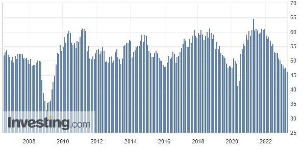 這也是該指標(biāo)連續(xù)第五個(gè)月在50榮枯線下方,表明該行業(yè)正處于收縮。若剔除新冠疫情大流行時(shí)期的數(shù)據(jù),3月的制造業(yè)PMI將創(chuàng)2009年以來新低。
