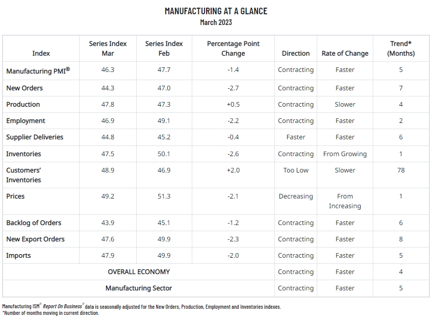 周一(4月3日)紐市時(shí)段,美國供應(yīng)管理協(xié)會(huì)(ISM)公布的數(shù)據(jù)顯示,美國3月制造業(yè)采購經(jīng)理人指數(shù)(PMI)錄得46.3,為2020年5月以來的最低讀數(shù),遜于2月的47.7和市場預(yù)期的47.5。