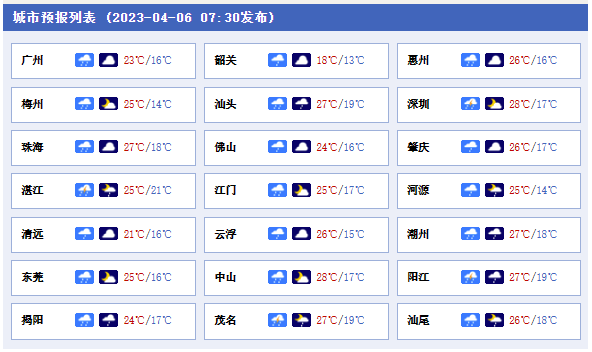 城市中,廣州今天白天陰天,有中雷雨局部暴雨;夜間陣雨轉(zhuǎn)陰天到多云;氣溫介于17℃~24℃之間;相對(duì)濕度介于90%~98%之間;吹輕微至和緩的偏北風(fēng)。