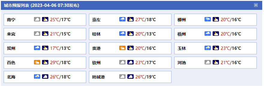 南寧市:今天白天陰天間多云,局地有陣雨或雷雨,今天晚上多云,東北風2~3級,最低溫度17℃,最高溫度25℃。