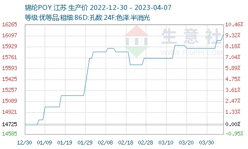 據(jù)生意社商品行情分析系統(tǒng)顯示,上周(4月3—7日),錦綸長(zhǎng)絲價(jià)格上漲,截止2023年4月7日,江蘇地區(qū)錦綸長(zhǎng)絲DTY(優(yōu)等品;70D/24F)報(bào)價(jià)18360元/噸,較上周上漲260元/噸,周漲幅1.44%;錦綸POY(優(yōu)等品;86D/24F)報(bào)價(jià)16125元/噸,較上周上漲225元/噸,周漲幅1.42%;錦綸FDY(優(yōu)等品:40D/12F)價(jià)格報(bào)19000元/噸,較上周上漲175元/噸,周漲幅0.93%。