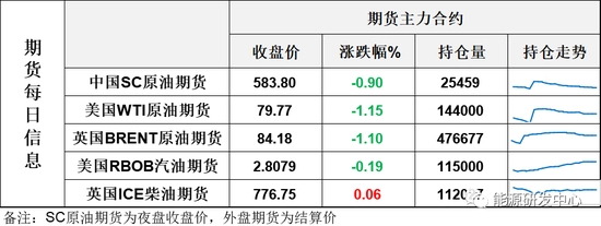 【1】WTI主力原油期貨收跌0.93美元,跌幅1.15%,報79.77美元/桶;布倫特主力原油期貨收跌0.94美元,跌幅1.1%,報84.18美元/桶;INE原油期貨收跌0.9%,報583.8元。