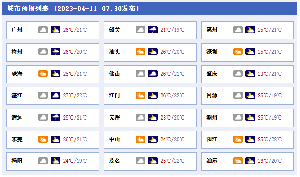 11日,韶關(guān)、清遠(yuǎn)和肇慶市縣陰天間多云轉(zhuǎn)(雷)陣雨,其余市縣多云到陰天,局部小雨;大部分市縣有早晚(輕)霧。早晨最低氣溫:粵北的北部市縣14℃~17℃,其余市縣18℃~22℃。