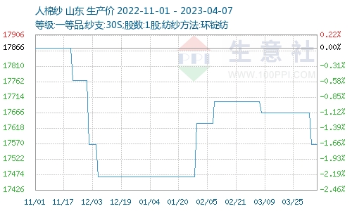 據(jù)生意社商品行情分析系統(tǒng)顯示,截止4月7日人棉紗(30S,環(huán)錠紡,一等品)出廠均價為17566元/噸,較上周價格下跌100元/噸。