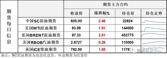 【1】WTI主力原油期貨收漲1.56美元,漲幅1.91%,報83.09美元/桶;布倫特主力原油期貨收漲1.72美元,漲幅2.01%,報87.33美元/桶;INE原油期貨收漲2.46%,報605元。