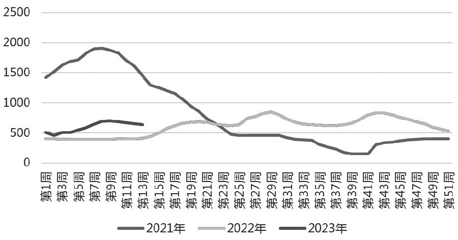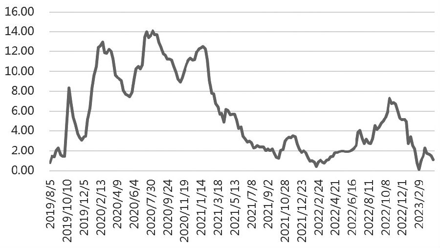 2022年10月下旬開始,2號(hào)肉鮮凍價(jià)差持續(xù)走低,并于2023年2月9日創(chuàng)近4年新低(0.14元/公斤)。春節(jié)后,凍品出現(xiàn)明顯的渠道補(bǔ)庫需求,鮮凍價(jià)差短時(shí)走高。隨著凍品補(bǔ)庫需求得到滿足,鮮肉消費(fèi)卻持續(xù)低迷,實(shí)際的凍品消費(fèi)(主要指加工產(chǎn)品消費(fèi))又處于正常狀態(tài),鮮凍價(jià)差繼續(xù)走低,截至4月6日當(dāng)周,2號(hào)肉鮮凍價(jià)差為1.10元/公斤。