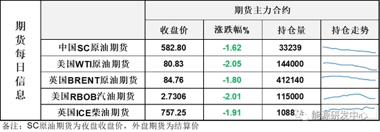 【1】WTI主力原油期貨收跌1.69美元,跌幅2.05%,報(bào)80.83美元/桶;布倫特主力原油期貨收跌1.55美元,跌幅1.8%,報(bào)84.76美元/桶;INE原油期貨收跌1.62%,報(bào)582.8元。