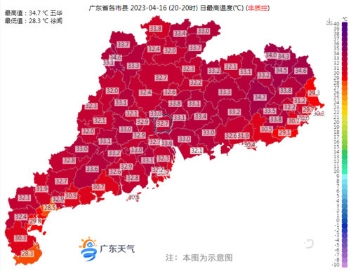 天氣實況:16日,我省大部晴間多云,我省最高氣溫較15日普遍上升,具體分布:南部沿海市縣介于28℃~31℃,其余大部分市縣介于32℃~34℃,其中梅州大埔錄得全省最高溫度34.5℃。