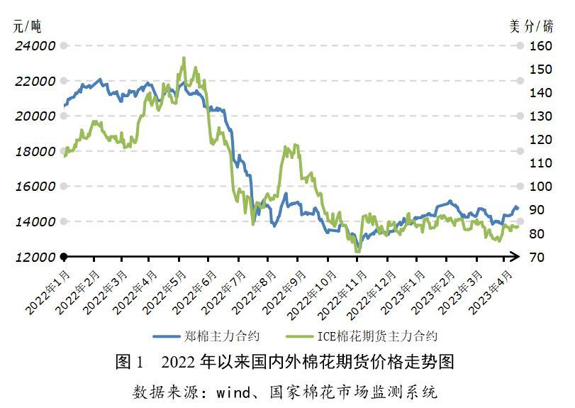 3月中旬以來,紡織內(nèi)銷市場延續(xù)好轉(zhuǎn),最新發(fā)布的新年度棉花種植意向下降,及原油價格大幅走強等多因素推動,鄭棉價格先抑后揚,最高至4月14日的15025元/噸,現(xiàn)貨價格穩(wěn)中上漲為主。國內(nèi)棉價整體走勢強于國際棉價。截至2023年4月14日,鄭州商品交易所棉花期貨主力合約結(jié)算價為14930元/噸,較3月中旬上漲6.45%;代表內(nèi)地標(biāo)準(zhǔn)級皮棉市場價格的國家棉花價格B指數(shù)為15443元/噸,較3月中旬上漲0.90%。