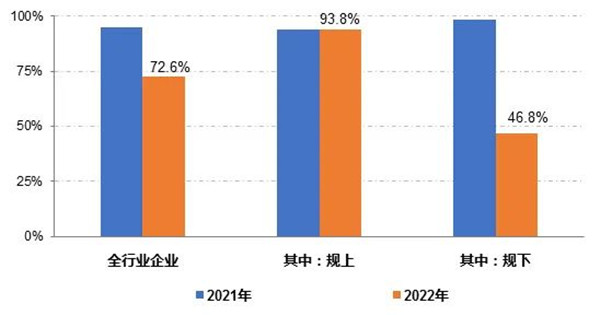 跟蹤數(shù)據(jù)顯示,52家重點產(chǎn)業(yè)集群內(nèi)共4.2萬戶紡織企業(yè),其中8%為規(guī)模以上企業(yè),從構(gòu)成來看中小微紡織企業(yè)占據(jù)絕大多數(shù)。2022年,集群內(nèi)開工企業(yè)數(shù)占比為98.1%,較2021年微增0.3個百分點。但受國內(nèi)疫情反復、國內(nèi)外市場需求不足、庫存壓力抬升等因素影響,企業(yè)產(chǎn)銷銜接階段性受阻,產(chǎn)銷率明顯下滑。2022年,集群企業(yè)產(chǎn)銷率僅為72.6%,較2021年回落22.4個百分點;其中,規(guī)模以上企業(yè)生產(chǎn)開工節(jié)奏、市場訂單及渠道更為穩(wěn)定,抗風險能力相對較強,全年產(chǎn)銷率仍保持了93.8%的較高水平,但規(guī)模以下中小微紡織企業(yè)產(chǎn)銷形勢持續(xù)波動,經(jīng)營困難情況時有發(fā)生,2022年產(chǎn)銷率僅為46.8%,為近年來的較低水平。