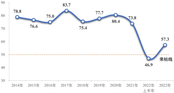根據(jù)中國產(chǎn)業(yè)用紡織品行業(yè)協(xié)會(以下簡稱“協(xié)會”)對近300家樣本企業(yè)的調(diào)研,行業(yè)2022年的景氣指數(shù)為57.3,與2021年同期(73.8)相比下降明顯,但較2022年上半年已回升至榮枯線以上。