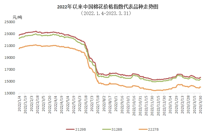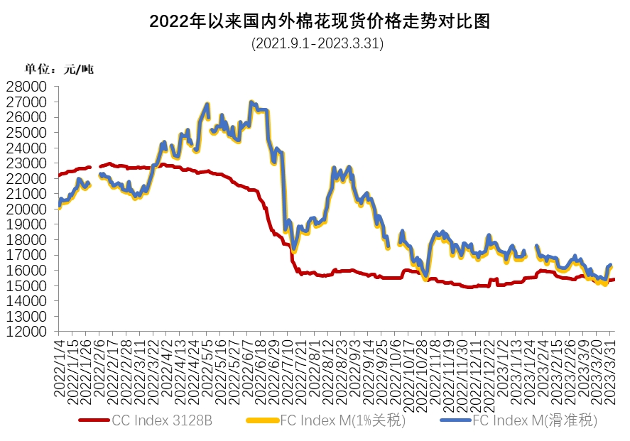 3月,受美國硅谷銀行倒閉引發(fā)銀行業(yè)危機(jī)、全球商品市場(chǎng)震蕩下行、全球需求疲弱等因素影響,國際棉價(jià)震蕩下跌。3月ICE主力合約月均結(jié)算價(jià)在80.92美分/磅,環(huán)比下跌3.17美分,跌幅3.8%;中國進(jìn)口棉價(jià)格指數(shù)FCIndexM月均為94.88美分/磅,環(huán)比下跌4.33美分;月底為96.9美分/磅,環(huán)比下跌2.82美分,1%關(guān)稅下折人民幣16235元/噸,高于同期國內(nèi)現(xiàn)貨888元,內(nèi)外棉價(jià)價(jià)差較上月收窄284元左右。