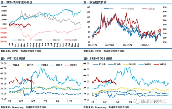 連續(xù)四周收漲之后,油價(jià)上周一度跌超6美元,周五夜盤油價(jià)開始有企穩(wěn)跡象。2023年的原油市場(chǎng)就是海面,風(fēng)吹波浪起,除了持續(xù)影響市場(chǎng)的各類地緣因素,3月之后歐美銀行業(yè)危機(jī)及沙特為首的OPEC+自愿減產(chǎn)等因素狂風(fēng)勁吹油價(jià)更是進(jìn)一步放大了波動(dòng)。但整體來看今年到現(xiàn)在為止油價(jià)整體處于一個(gè)多空因素此消彼長(zhǎng)下的大震蕩區(qū)間之內(nèi),過去一周油價(jià)就迎來了OPEC減產(chǎn)之后的單邊回調(diào)行情,油價(jià)下跌的直接原因是需求不振消耗市場(chǎng)信心,歐美成品油裂解差繼續(xù)走弱讓人越來越擔(dān)心需求端不給力的表現(xiàn)可能拖累油價(jià),而同期宏觀層面美聯(lián)儲(chǔ)5月加息也對(duì)金融市場(chǎng)市場(chǎng)施壓,各類風(fēng)險(xiǎn)資產(chǎn)上周普遍回落,這讓前期不斷累積的調(diào)整需求開始主導(dǎo)市場(chǎng),各類利空因素綜合作用下油價(jià)出現(xiàn)了單邊回落。SC主力合約靠近550元,布倫特一度跌至80美元附近,接近回填OPEC減產(chǎn)帶來的跳空缺口。