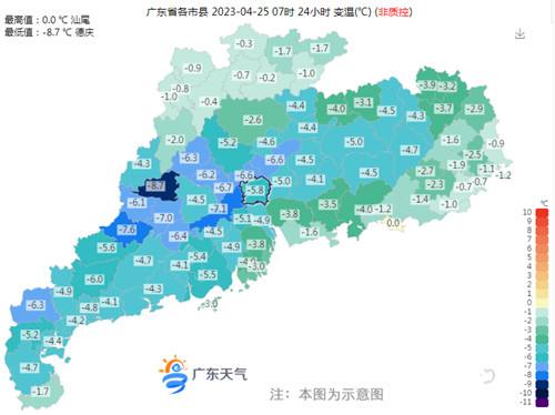 天氣實況:24日夜間到25日早晨,梅州出現(xiàn)了小到中雨局部大雨,其余市縣陰天,出現(xiàn)了分散陣雨;25日早晨冷空氣進(jìn)一步南下,07時清遠(yuǎn)和韶關(guān)北部、雷州半島南部和粵東沿海市縣較24日同期下降1℃~2℃,其余大部分市縣下降3℃~7℃。