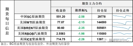 【1】WTI主力原油期貨收跌1.69美元,跌幅2.15%,報(bào)77.07美元/桶;布倫特主力原油期貨收跌1.94美元,跌幅2.35%,報(bào)80.6美元/桶;INE原油期貨收跌2.58%,報(bào)551.2元。