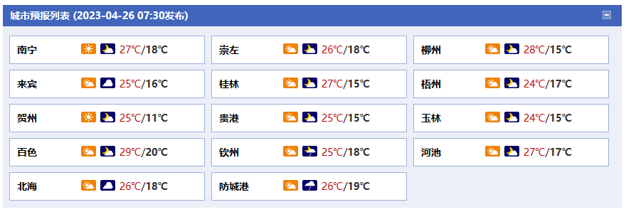 27日白天到晚上,全區(qū)多云轉陰天大部有小雨,其中沿海及桂東北局地有中雨到大雨。