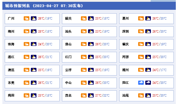 27日,粵西、珠江三角洲西部市縣、清遠(yuǎn)和韶關(guān)多云到陰天,有分散(雷)陣雨,其余市縣多云為主,局部有(雷)陣雨,中西部市縣早晚有(輕)霧。早晨最低氣溫:粵北偏北市縣11℃~14℃,南部沿海和珠江三角洲中南部市縣17℃~22℃,其余市縣14℃~17℃。