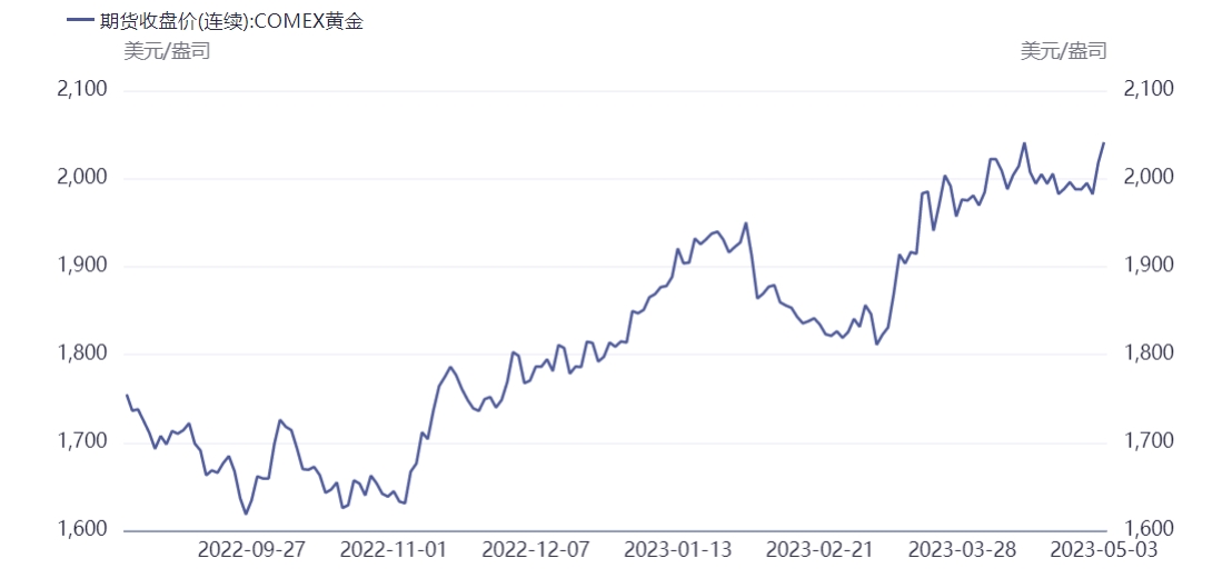 伴隨美聯(lián)儲的加息聲,國際現(xiàn)貨黃金價格大幅上漲,盤中刷新歷史新高至2076.2美元/盎司。截至北京時間5月4日17時,現(xiàn)貨黃金價格回落至2035美元/盎司。截至記者發(fā)稿,現(xiàn)貨黃金今年漲幅達12.39%。