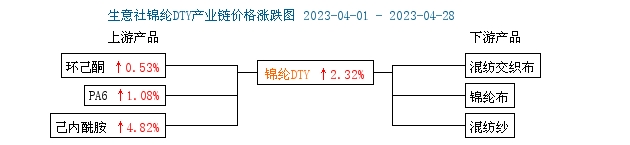2023年4月,錦綸長(zhǎng)絲上游原料己內(nèi)酰胺價(jià)格攀升,但下游需求端弱勢(shì)難改,錦綸長(zhǎng)絲價(jià)格漲幅受抑。供應(yīng)端來(lái)看,錦綸行業(yè)開(kāi)工維持穩(wěn)定,貨源供應(yīng)量充足,;從下游來(lái)看,下游及終端領(lǐng)域需求跟進(jìn)良好,但整體市場(chǎng)仍處于供大于求狀態(tài),下游需求仍觀望心態(tài)居多,雖然已經(jīng)進(jìn)入傳統(tǒng)旺季,但需求仍不如預(yù)期,按需跟進(jìn)為主。