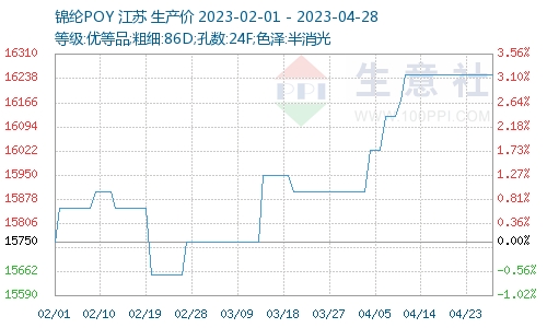 據(jù)生意社商品行情分析系統(tǒng)顯示,2023年4月,錦綸長(zhǎng)絲價(jià)格小幅攀升。截止2023年4月28日,江蘇地區(qū)錦綸長(zhǎng)絲DTY(優(yōu)等品;70D/24F)報(bào)價(jià)18520元/噸,較月初價(jià)格上漲420元/噸,月漲幅2.32%;錦綸POY(優(yōu)等品;86D/24F)報(bào)價(jià)16250元/噸,較月初價(jià)格上漲350元/噸,月漲幅2.20% 錦綸FDY(優(yōu)等品:40D/12F)價(jià)格報(bào)19200元/噸,較月初價(jià)格上漲375元/噸,月漲幅1.90%。