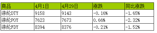 4月滌綸長(zhǎng)絲市場(chǎng)均價(jià)漲跌情況 單位:元/噸