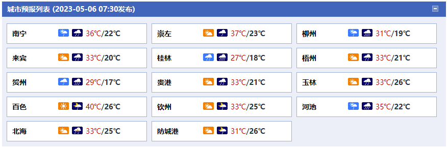 南寧市:今天白天多云有陣雨或雷雨,今天晚上中雨,局地大雨或暴雨,并伴有雷暴大風(fēng)等強對流天氣,南轉(zhuǎn)東北風(fēng)2~3級,局地陣風(fēng)5~7級,最高氣溫36℃,最低氣溫22℃。