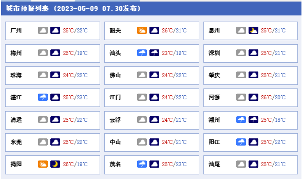 9日,粵西、珠三角西部市縣陰天,有陣雨局部大雨,其余市縣多云間陰天,局部有陣雨。早晨最低氣溫:粵北17℃~20℃,雷州半島23℃~25℃,其余市縣21℃~23℃。
