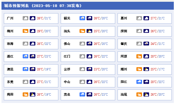 10日,西部市縣多云到陰天,有(雷)陣雨局部大雨,其余市縣多云間陰天,有分散陣雨。白天最高氣溫:河源、梅州、雷州半島和珠江三角洲大部分市縣26℃~27℃,其余大部分市縣24℃~25℃。